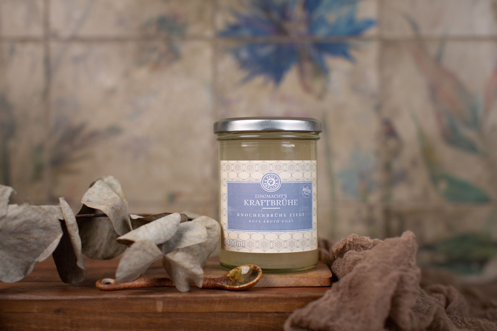 Este caldo de huesos se cocina lentamente durante más de 18 horas para extraer de los huesos de cabra nutrientes esenciales como aminoácidos, minerales, colágeno, glucosamina y condroitina.