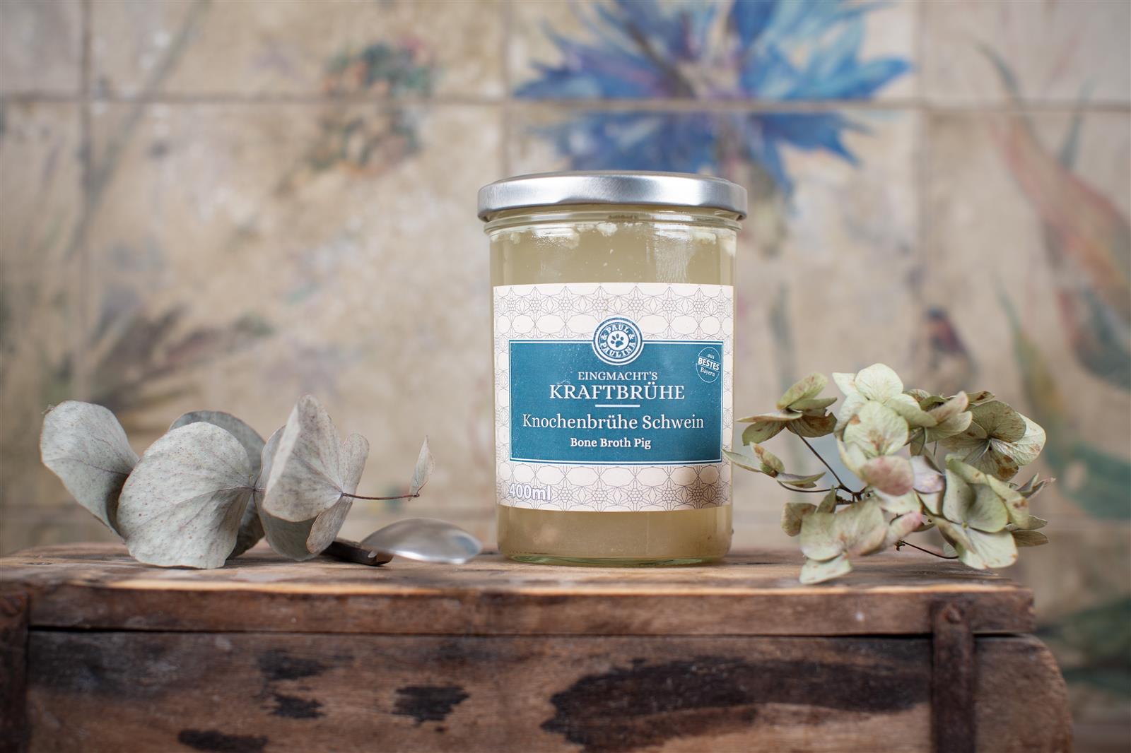 Este caldo de huesos se cocina lentamente durante más de 18 horas para extraer de los huesos de cerdo nutrientes esenciales como aminoácidos, minerales, colágeno, glucosamina y condroitina.